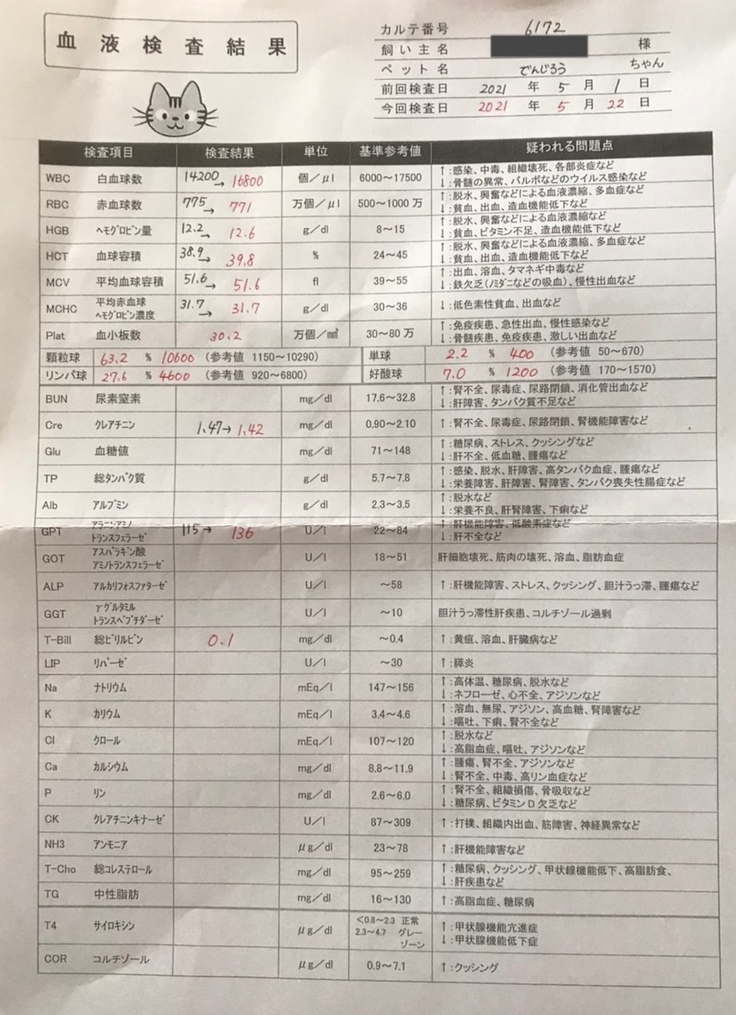 そして2021年4月26日の朝、突然右の鼻から鼻血が出て、再発を疑い病院で検査をしてもらいました。検査には全身麻酔が必要です。しかし、でんじろうの場合は16歳で高齢ということもあり全身麻酔をした場合のリスクが高く、そのまま意識が戻らない可能性もあるとのことでした。なので、全身麻酔での検査はせず、血液検査やレントゲンや症状を確認の上、再発で間違いないだろうとのことで鼻腔内リンパ腫再発と診断されました。