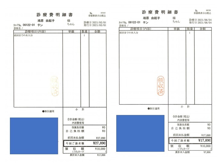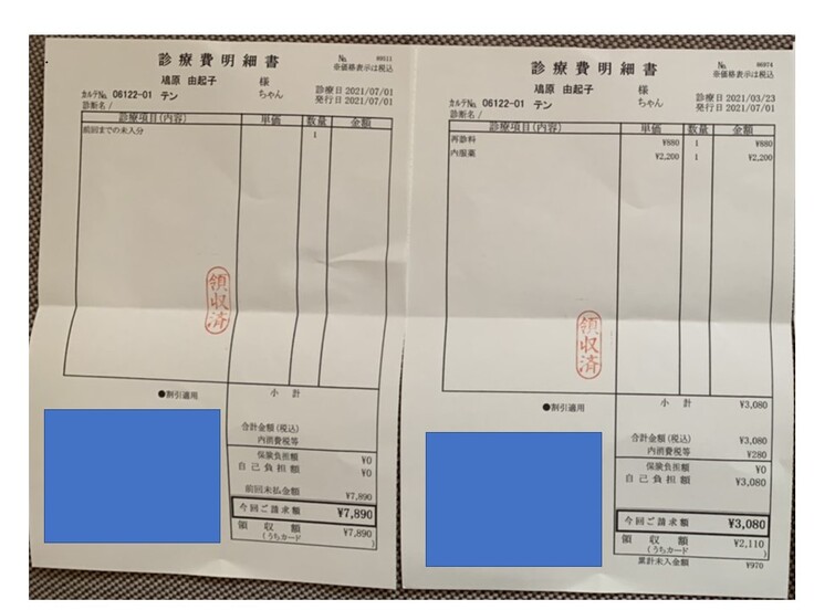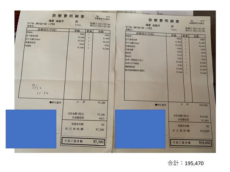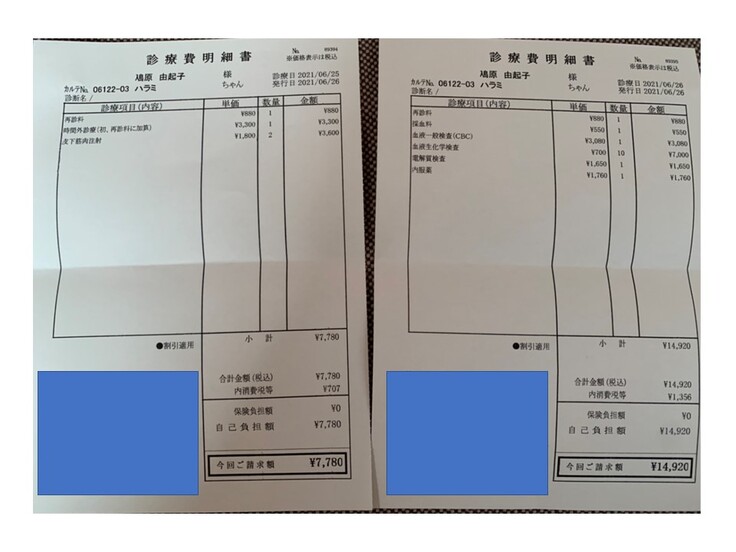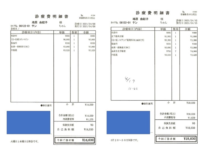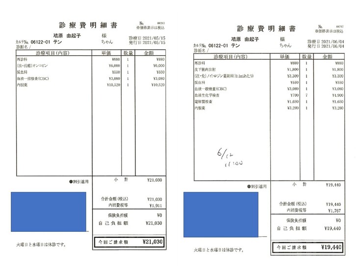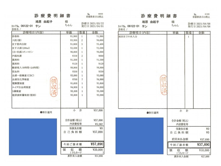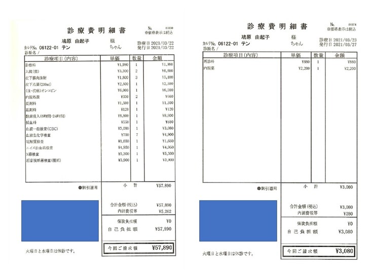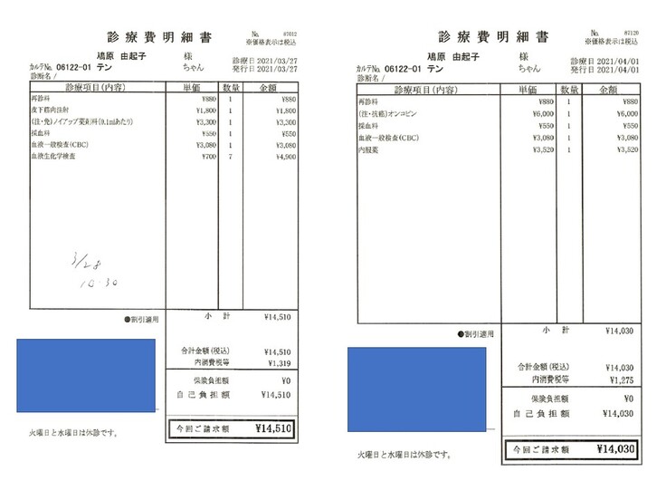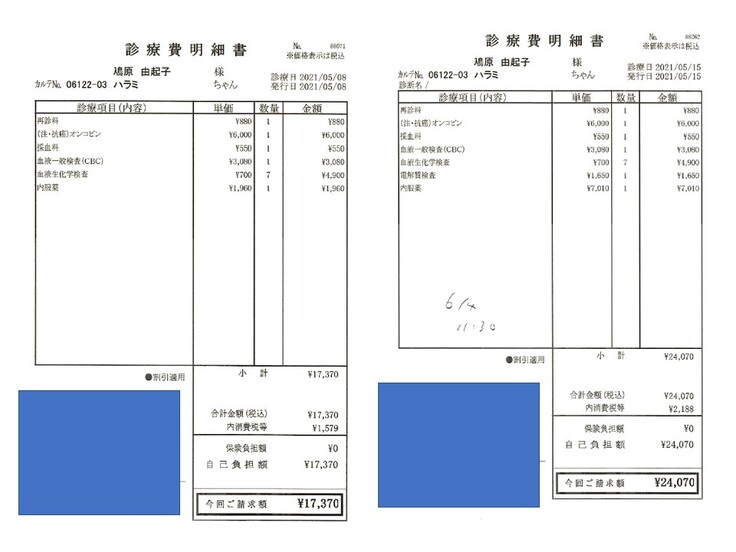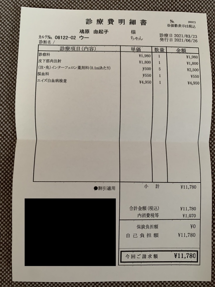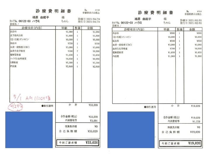 2021.03.22 ¥57,890 (入院、血液検査、エコー、エイズ検査、抗がん剤注射) 領収済み