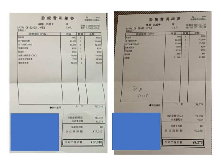 2021.07.01 ¥17,310 (採血、栄養剤点滴、皮下筋肉注射)