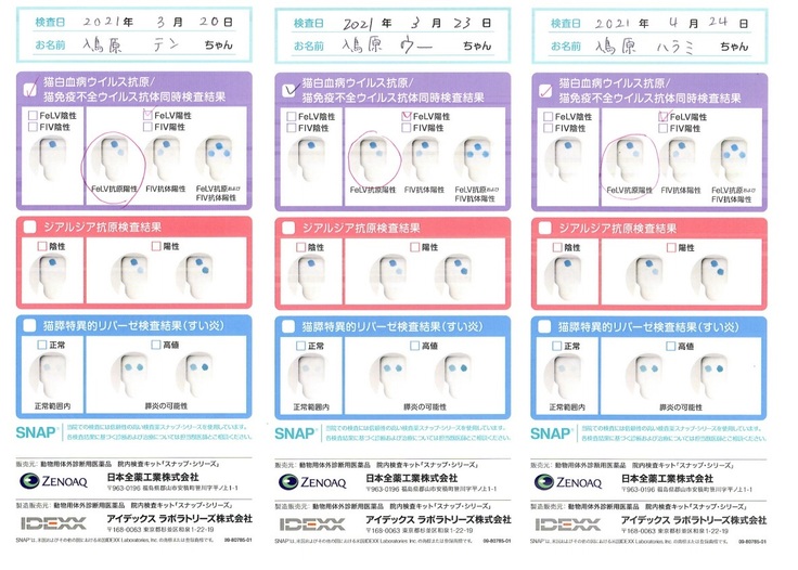 ↓3匹のウイルス検査結果↓