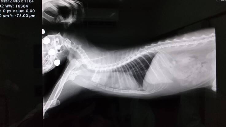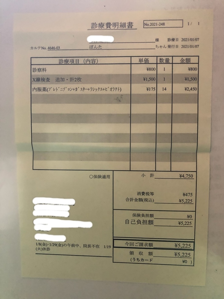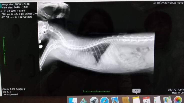 2021年1月7日胸水が溜まってないかレントゲンを撮ってもらい少し溜まっているが、抜くまでにはなりませんでした。胸のレントゲンを見せてもらったら通常の子より胸のほとんどが真っ白で治療をしないと後2ヶ月も生きられないと言われました。