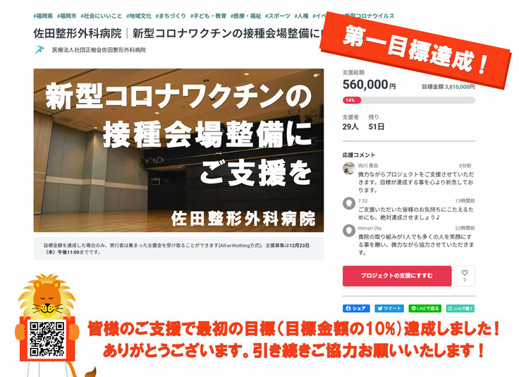 皆様のご支援で最初に目標にしていた[目標金額の10%]を達成いたしました。