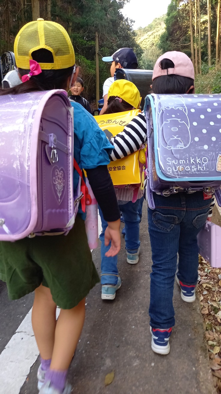大きいランドセルを背負った1年生は、入学時にはひ弱な印象ですが半年後にはしっかりした足取りで峠道を登ります。上級生は、下級生を優しくリードしながら登下校しています。