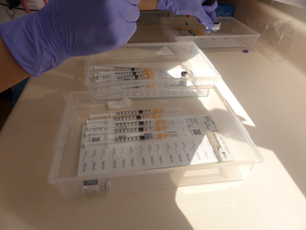 ワクチン調製には薬剤師が加わり、2人以上で作業してダブルチェックを行います。