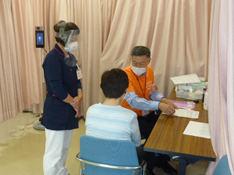 写真は医師として、接種が可能か、予診をとって確認をしている様子です。万一、接種後、具合の悪くなった人が出ても、複数の医師がいることで安全な接種が実現します。医師がひとりだけであれば、もし重篤なアナフィラキシーが発生した際には、接種がストップしてワクチンが無駄になることもありえます。