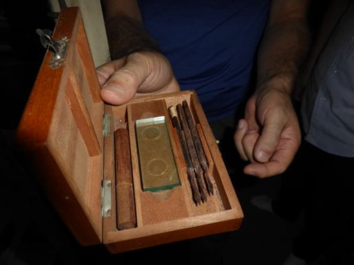 最後に、野村医院のオールドクリニックでお宝を拝見しました。特に、写真の種痘の器具は、時節柄、目をまるくしました。写真のスライドグラスの上で、接種製剤を調製したのです。すごいです。