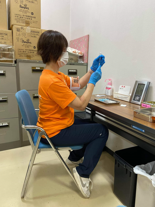 竹内さんは、6月から9月までコンスタントに来てくれました。実は、ワクチン接種ボランティア支援の当初は、6月の支援が手薄で、やさしい竹内さんに白羽の矢をたててお願いしたという経緯がありました。7月、8月に入ると、一般に夏休みをあてやすいという状況もありました。しかし、6月にはそのようなわけにもいかず、6月の平日を竹内さんに数多くカバーしていただき感謝しています。注意を集中して、丁寧にワクチン調製いただいている様子が写真から伝わります。