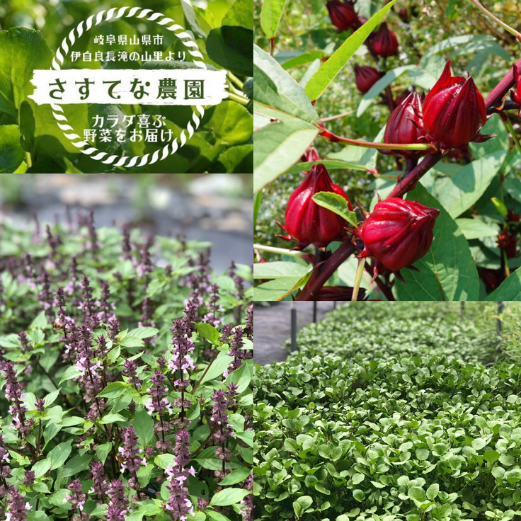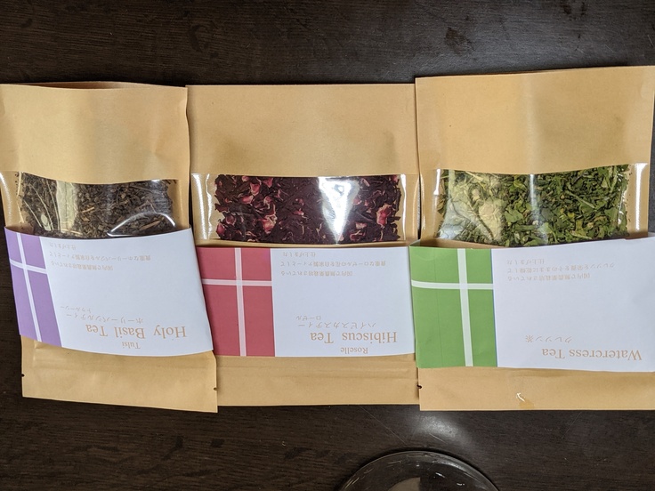 ハーブティーは、クレソン、ホーリーバジル、ローゼル三種があります。(岐阜市保健所食品衛生課許認可済)