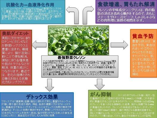 クレソンー山からの綺麗な水で育てた「清流クレソン」必須栄養素No1野菜。クレソン粉は、ベータカロテンの宝庫。美肌、糖尿病にも効くとされる。