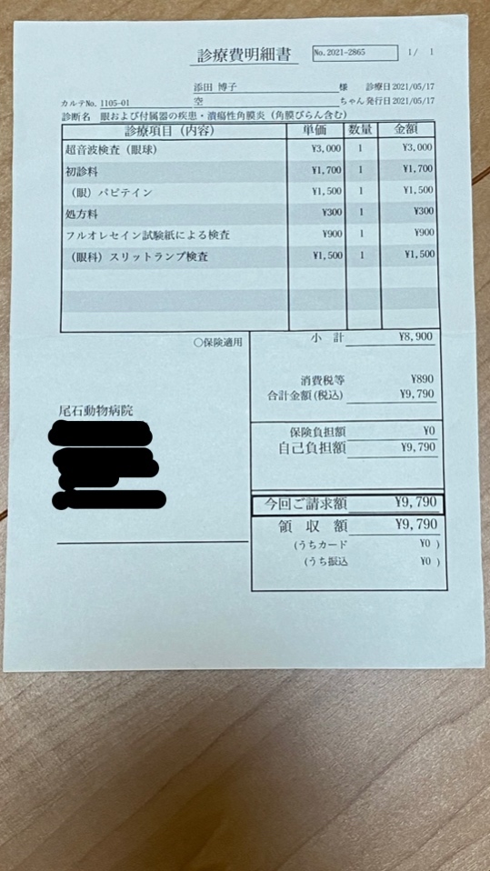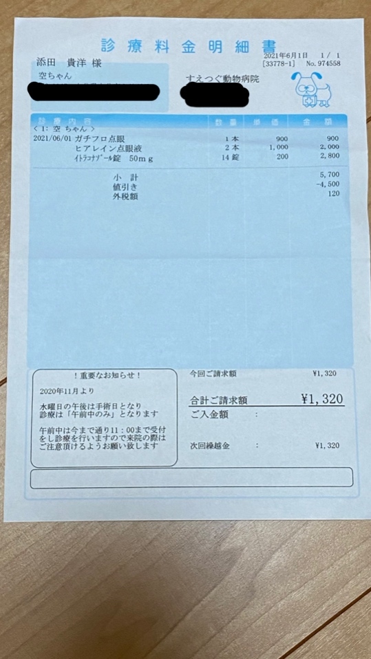 4月28日、設備の整ったB病院を受診。眼圧や眼底に異常はなく、眼球への傷や、大きさの異常もありませんでした。鼻水から細菌が出ているとのことで、抗生剤の内服薬と点眼薬が処方され、1週間後の再来となりました。