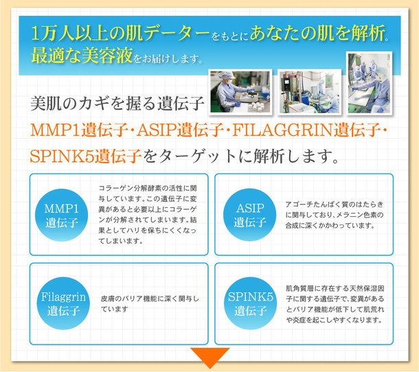 肌遺伝子を解析。肌遺伝子の組み合わせに基づき、肌タイプにあわせた美容液をご送付します。