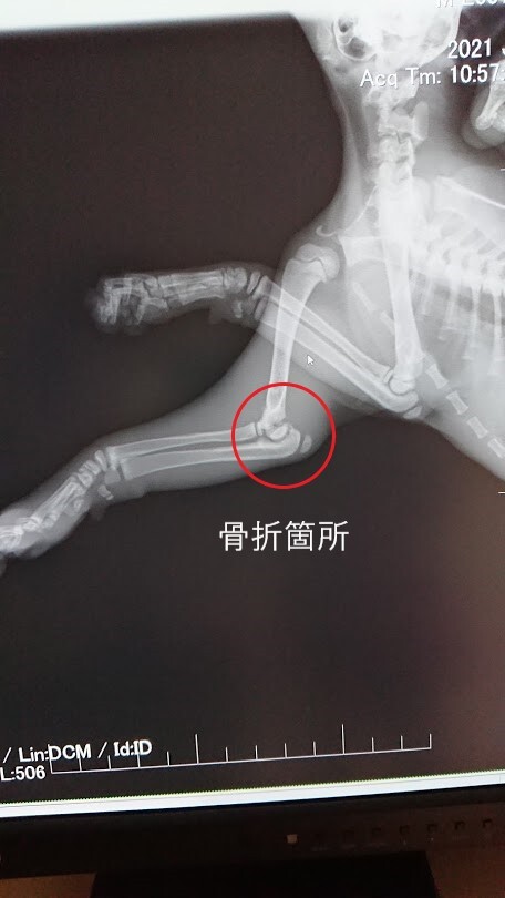 翌日には病院に連れていき、獣医さんに診ていただくと、交通事故に遭っており、左前脚は折れていると言われました。