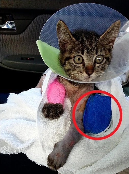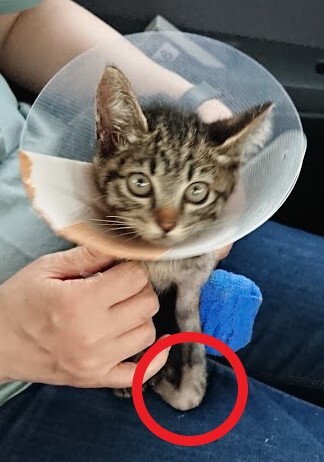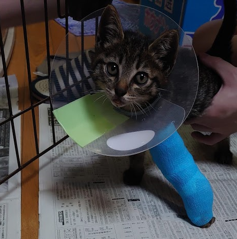結果はちょうど関節の部分が折れていて、治すには難しい手術になると説明を受けました。場合によっては切断の可能性もあるとのことです。今はギブスで固定しており、少しでも負荷のかからない生活ができるように子猫自身も頑張っています。