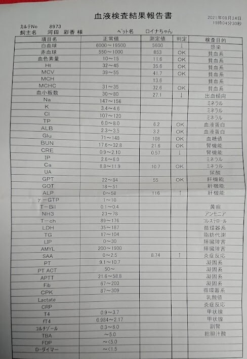 少し体温が高く、血液検査の結果、何項目か基準値から外れたものがありました。