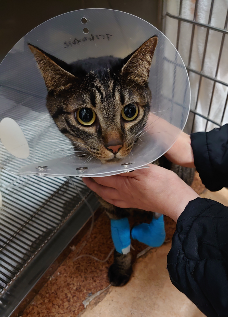 曲がっている左前脚の親指にあたる部分がじゅくじゅくしており、爪も無くなっていました。