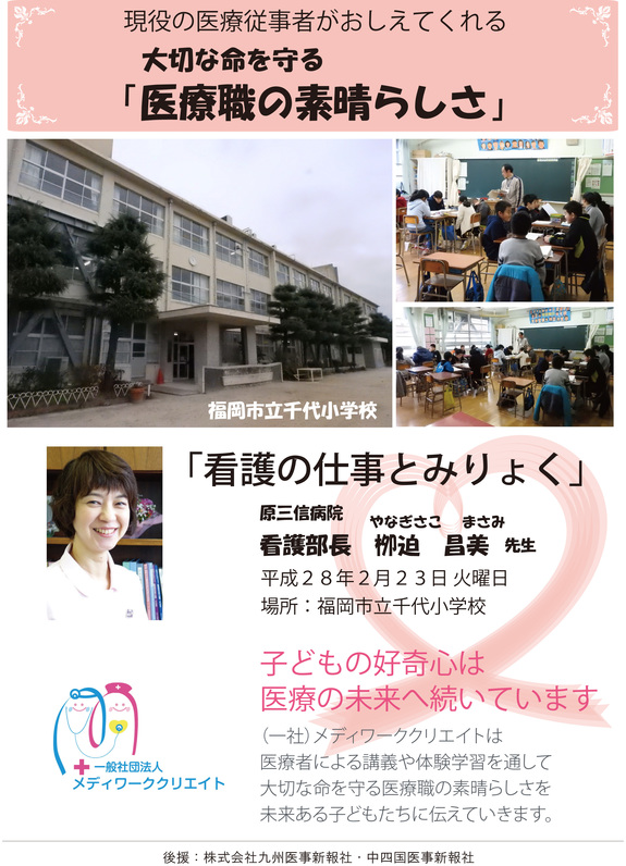 2016年2月23日には福岡市の小学校で看護師の講師を招いて、看護師の仕事や、看護職の魅力、車イスからの立ち上がり介護や、実際に医療現場で使われている器具などを使って児童にわかりやすく楽しく伝える企画も開催!