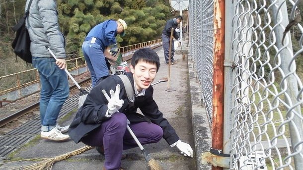 このうち、三江線沿線魅力化プロジェクトの実行委員会からは、代表の吉田と事務局のMが宇都井駅の清掃に参加してきました!宇都井駅では、応援団のメンバーや地元の住民の皆さん、約25人があつまりました。壊れていた宇都井駅の看板を直したり、116段の階段の掃除をしたり、ホームのすみっこに生えているこけや草などをスコップで取り除いたり、みんなで力を合わせてがんばりました!吉田も、116段の階段をこけや砂が入った袋を持って降りたり、一ほうきではいたりと、頑張っていました!ちょうど、掃除のおわったころ、浜原方面行きの車両がやってきて、駅に停車しました!席がほぼ埋まる状態の乗車率で、みんなで手を振って旅の無事を祈りました!