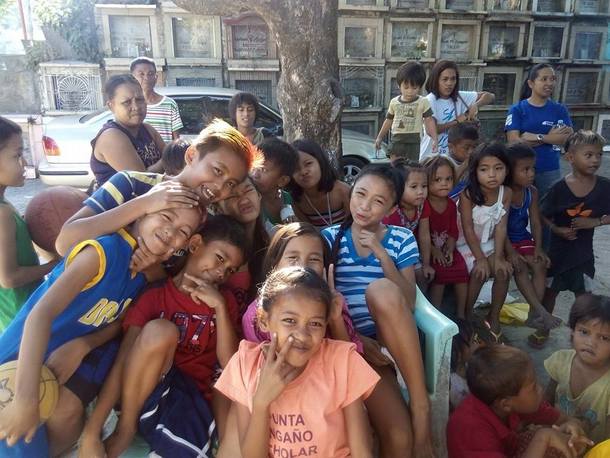 一番手前、ピンクのTシャツがハニーちゃんです。墓場暮らしの仲よし友だちと一緒のようです。背景からして墓地の入り口でしょう。