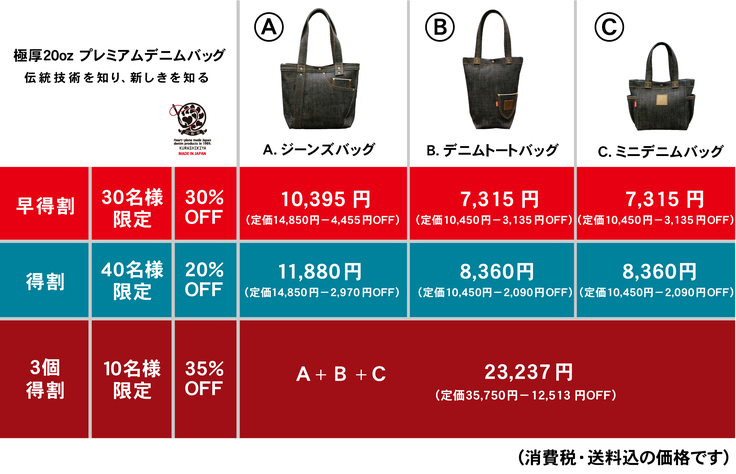 A.ジーンズバッグ、B.デニムトートバック、C.ミニデニムバックになります。