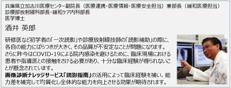 現在、”画像診断ナレッジサービス「読影指南」”は画像診断の精度向上に対する優位性が認められ、採用施設が増えつつあります。すでに”画像診断ナレッジサービス「読影指南」”を導入している兵庫県立加古川医療センターでは、研修医の臨床経験を補う目的でご利用いただいています。一方、診療放射線技師を養成している鈴鹿医療科学大学では、3,4年生全員が”画像診断ナレッジサービス「読影指南」”を用いて学習しています。このように既に医師や技師の育成にお使いいただいている施設では大変好評をいただいていますが、この機会に多くの医療機関などに”画像診断ナレッジサービス「読影指南」”を提供して、ひとりでも多くの医師や診療放射線技師の臨床経験を補うことにより画像診断の精度向上に役立てていきたいと考えています。その結果、疾患の早期発見により、患者やその家族の肉体的、経済的、さらには精神的な負担軽減に貢献することがメディカル指南車の願いです。