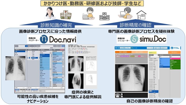その成果を利用して開発したメディカル指南車の”画像診断ナレッジサービス「読影指南」”は、「専門医」以外の医師や診療放射線技師に対して効率的に画像診断の精度向上をサポートできるサービスを提供します(下図)。画像診断ナレッジサービス「読影指南」は、単に特定の疾患の症例を理解するだけではなく、体系的に画像診断を理解して臨床現場で応用することができるこれまでにないサービスです。