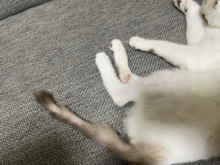 触ると痛がり、歩くときに左肢と擦りあうためかカサブタがよくできます。