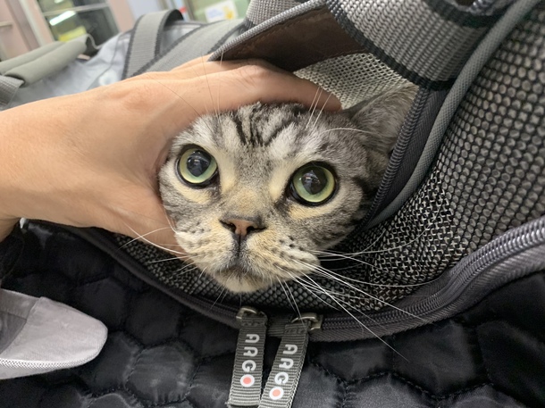 これまでの通院時に何度か通っている道ですが、今までとは比較にならない程のシル君の叫び声がキャリーから聞こえています。また、キャリーバッグの中でモゾモゾと動いております。真夏日の移動の際は保冷剤を使いながらも興奮で体温が上がり苦しそうな鳴き声を出した時もありました。あれから1.5ヵ月経った今、若干の緊張興奮はあるものの、パートナーに優しく撫でられながら車内の景色をじっと見ていますね。