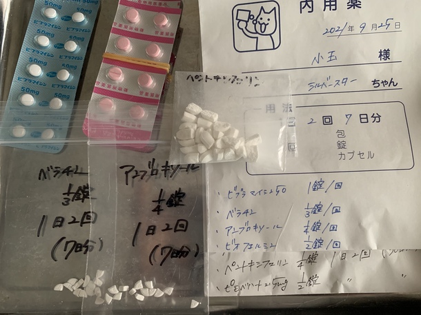 ご覧いただいている写真。。薬がまた増えてしまいました、、シル君頑張ろうね!