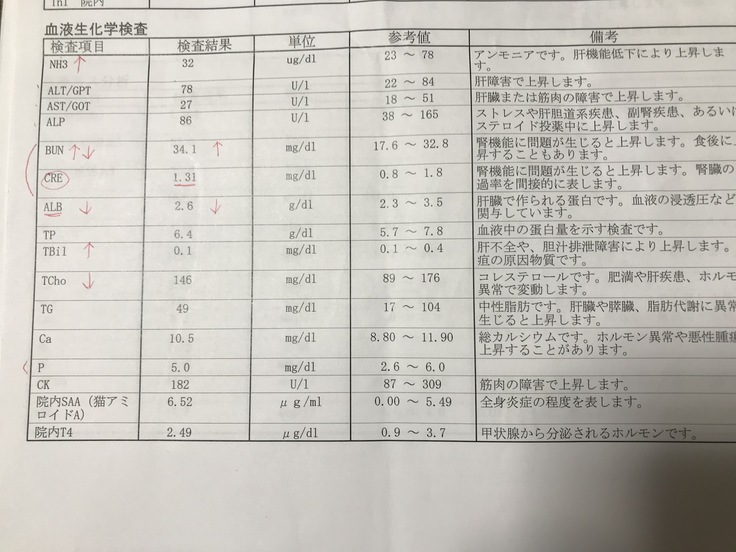 ↓腎不全や尿路損傷している場合に上昇するBUNという値が特に高かったです。