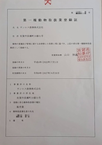 (写真は、2022年7月に取得した「動物取扱業・販売」の免許証)