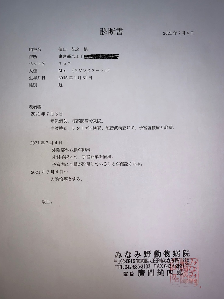 診断は、子宮蓄膿症となります。また、腎臓に対してのダメージも計り知れないとのことです。