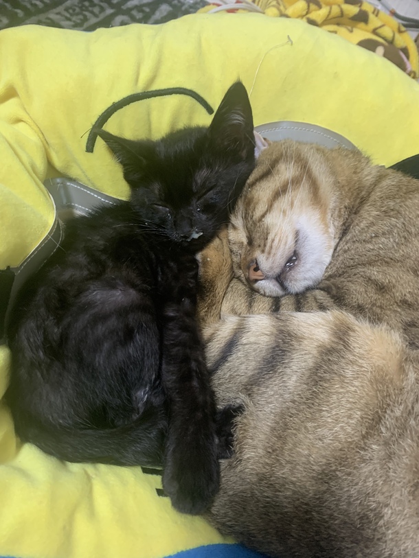 保護した黒猫ちゃんぽんず君ですがまだ鼻水がダラダラで呼吸がつらそうです...それなのに先住猫のきなこと遊びたいようでしきりに走り回ってます^ - ^疲れたら二人で仲良く寝てしまいます笑