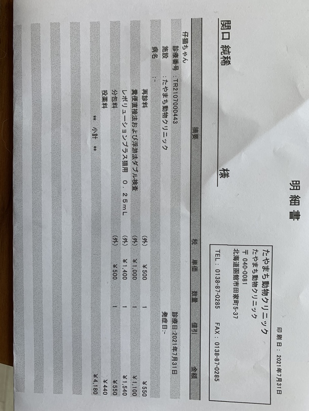 お腹の中に虫がいるみたいなのでお薬を塗ってもらいました!鼻水が全然治らないので違う種類の抗生物質に変更!これが猫が嫌がる味らしいですが、缶詰と一緒にあげたらペロリと食べてくれました😊早く良くなってねぽんず!!