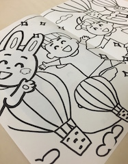 三十八花堂オリジナル子ども向け睡眠紙芝居「おねむちゃん にあえるかな?」をご紹介。パンフレットを開くと、「ぬりえ」になっています。「夢のなかで、こんな楽しい時間を過ごせるといいな…」と子どもたちにイメージしてもらいながら色を塗っていきます。
