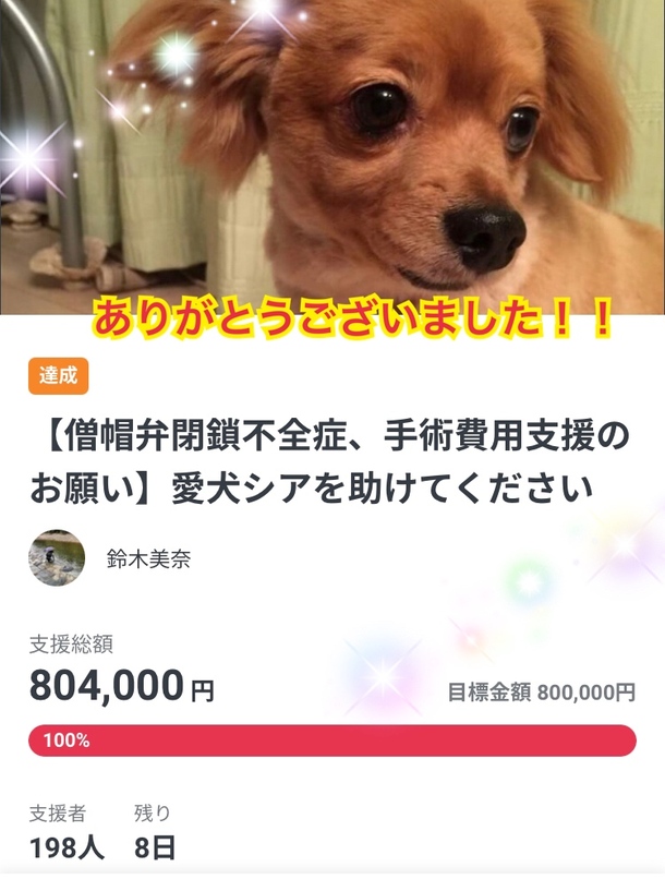 この度、愛犬手術費用のクラウドファンディングが達成されました🙌