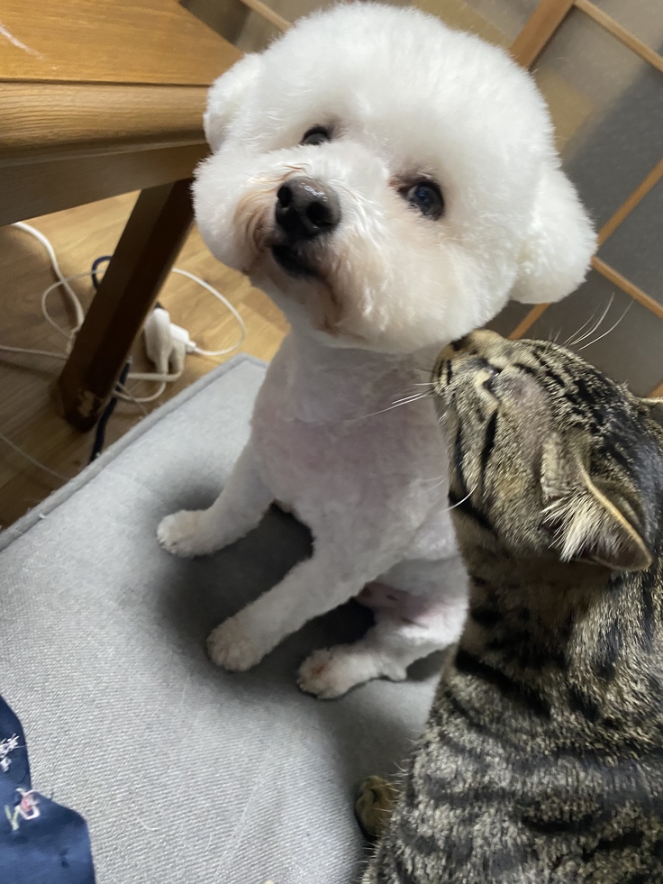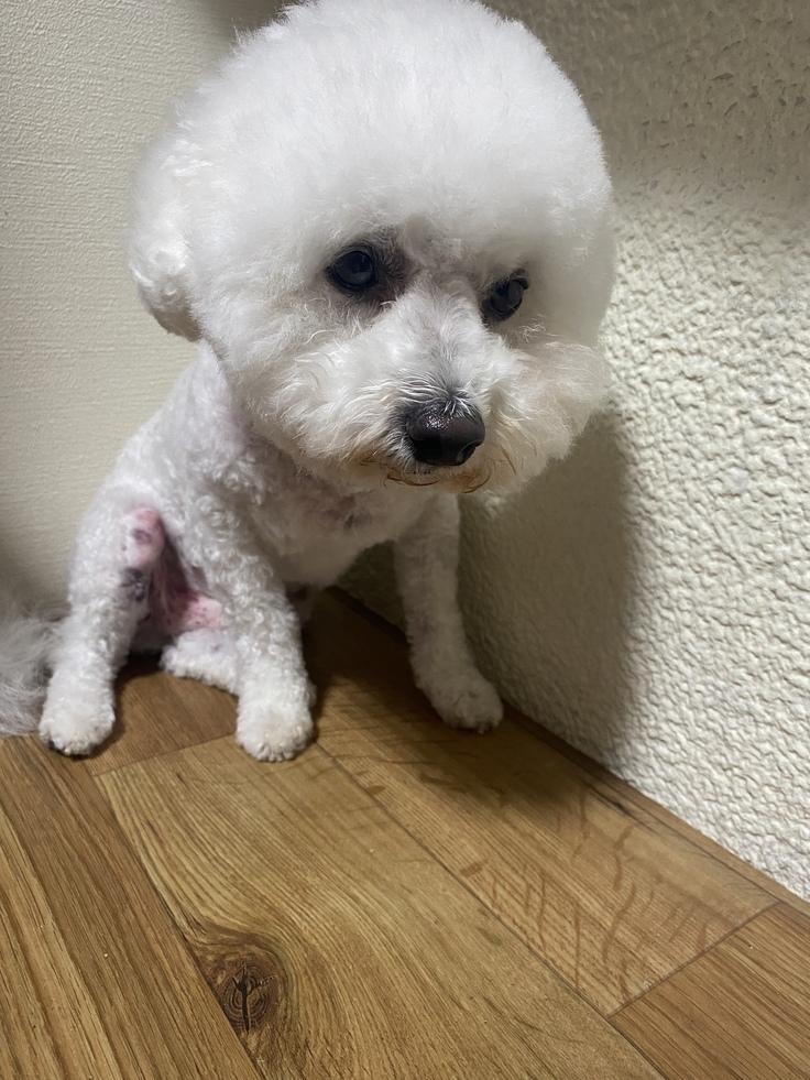 この年齢まで売れずに色々なペットショップを回っていた子で、当初はおしっこで毛が固まり、ビションなのかもわからないくらい劣悪な状態でした。