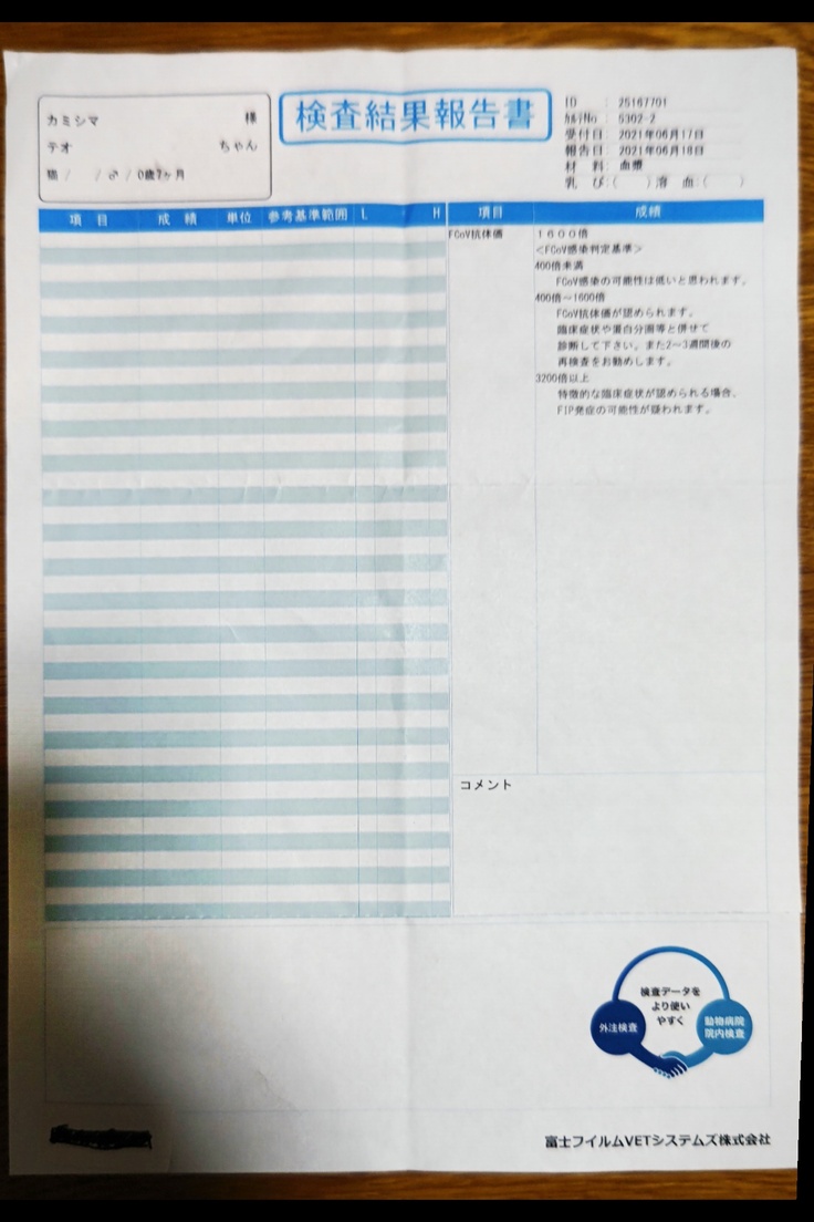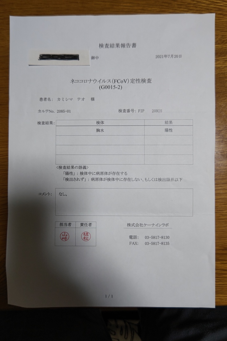 ネットで調べたことによって、猫伝染性腹膜炎は発症してから早くて数日~1ヶ月ほどで亡くなってしまう事を知りました。しかしテオの場合、元気は無くなったものの発症してから1ヶ月以上も生存していて詳しく検査もしておらず、口頭でFIPと診断されただけでしたので、私自身は違う病気を疑いました。そこで、以前飼っていた愛猫が通院していた、前述とは別の病院に連れて行き受診し、検査をして頂いたところ、検査結果は陽性でウェットタイプ、ただし数値的にはグレーであると診断されました。