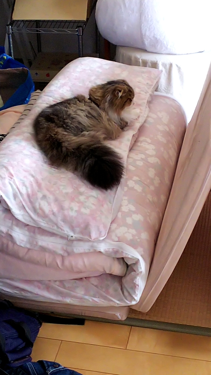 呼吸が荒くなる。通常時 毎分20~40回程度が、この日は毎分80回程度となり、かかりつけ医に診てもらい、レントゲン撮影。胸水が溜まっていたので胸水穿刺排液。「猫伝染性腹膜炎の可能性」と診断される。同時に「猫伝染性腹膜炎」という病気があることを初めて知る。