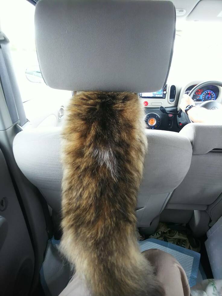 上の画像は病院へ向かっている道中でのテオ。あまりの緊張で、ヘッドレストとシートの間から様子見していました。