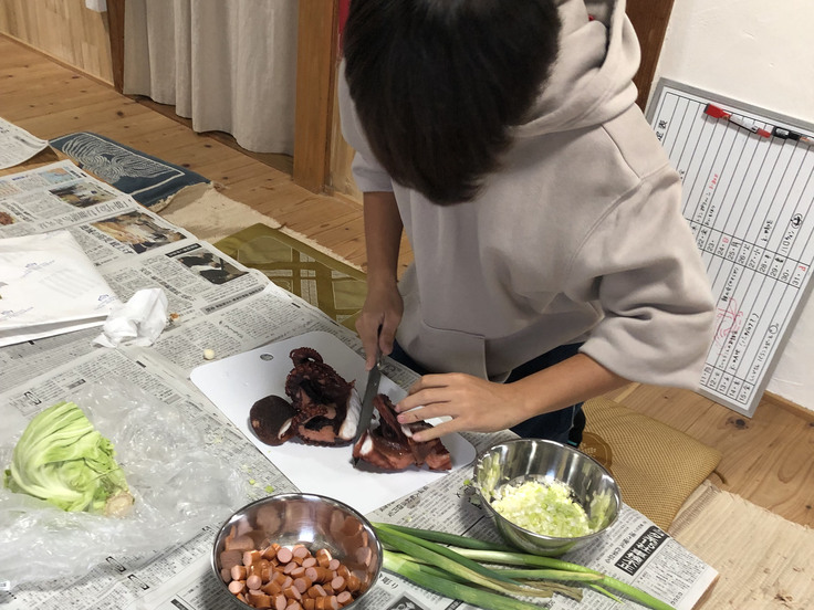 生地づくりや、タコやソーセージなどの具材切りをみんなで分担して、