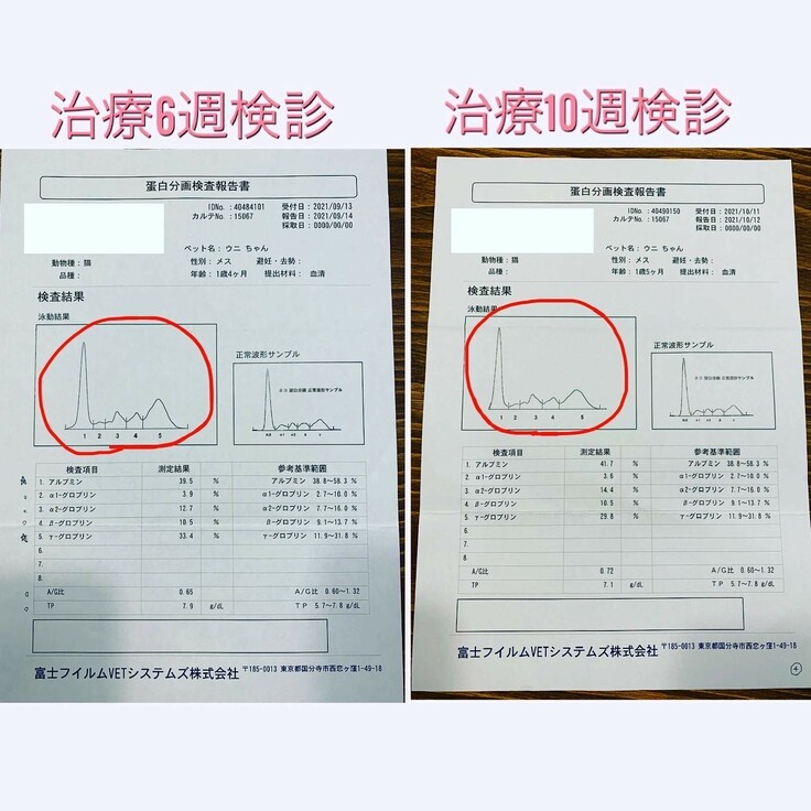 84日の投薬期間が終わったあとは3か月の経過観察期間に入ります。しかし数値的にはぎりぎりセーフという感じで、微妙な数値もいくつかあるので、まだまだ要注意とのこと。先生によると、未承認薬はFIPを治すお薬というよりは、ウイルスを抑え、体を守るための保守的な薬だそうです。