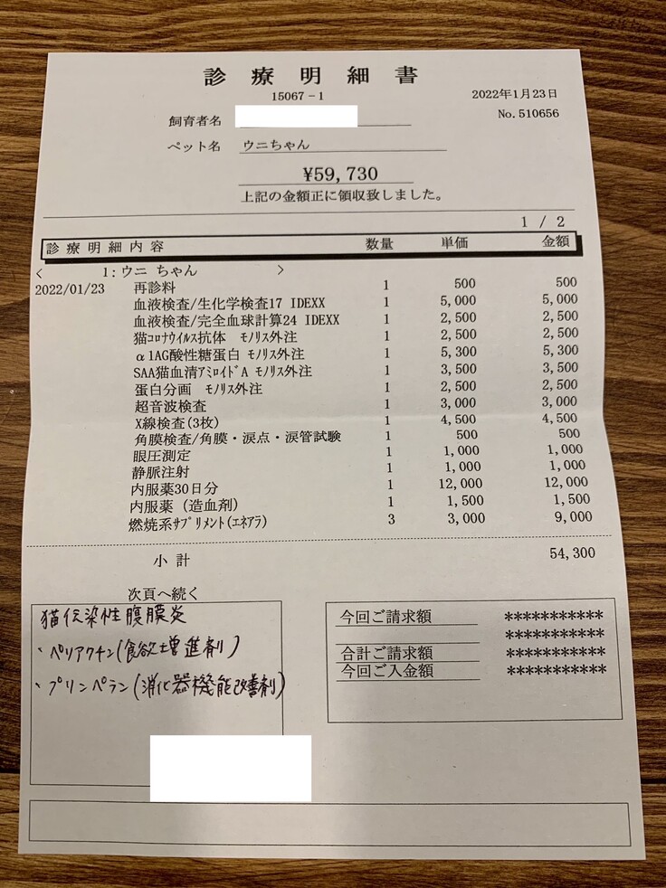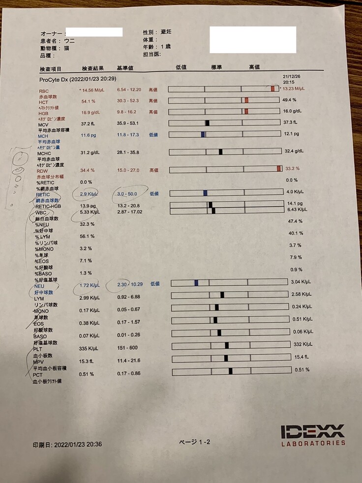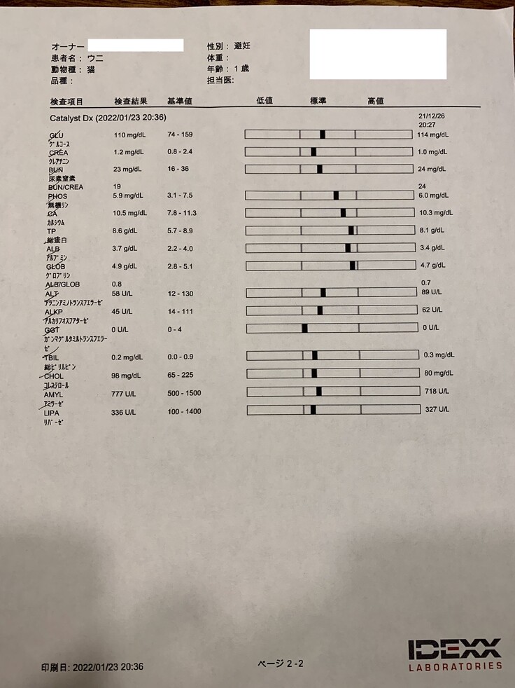 血液検査は…高値に出ている項目は全然問題ないそうですが、NEUという数値が低値なのがちょっと気になるけどFIP再発とかではなさそうなので様子をみましょう!とのことです。