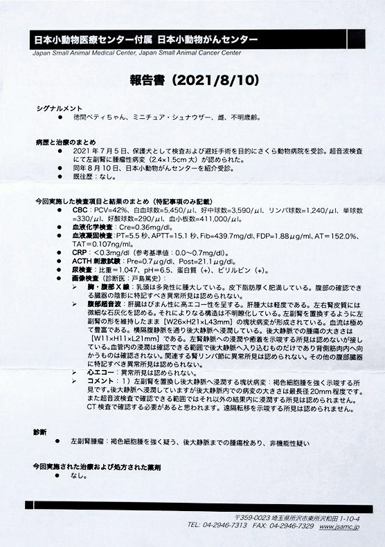 譲渡準備のために動物病院の健康診断にかけたところ、左副腎に腫瘍性病