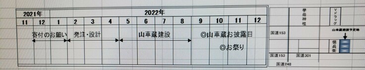- 山車保存会会員や地域住民からの寄付金で補填します。万が一補填ができなかった場合は規模を縮小して山車蔵を建設します
