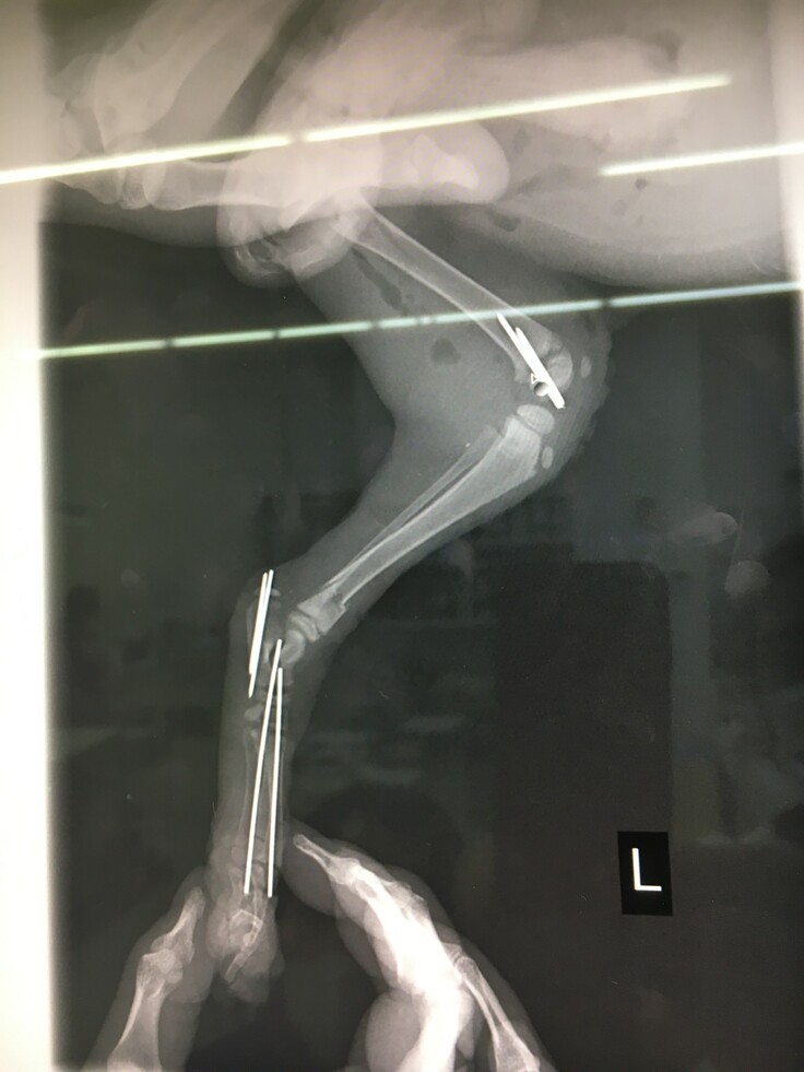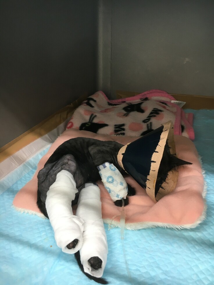 骨折部位は6本のピンで骨を固定し、両脚の裂傷部位の処置を施していただきました。前脚では抗生剤の点滴投与。低体温のため湯タンポと床暖房も。食欲はない。