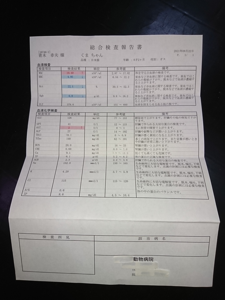 私と実家の家族であちらこちらの病院に電話するも、早朝のため応答無しか車で一時間以上かかる救急センターを紹介する音声案内が流れるばかり。一刻も早く診てもらわなければと電話し続けたところ幸いにも8時から受付に繋がる病院が見つかり、時間外診療ですぐに診ていただくことが出来ました。