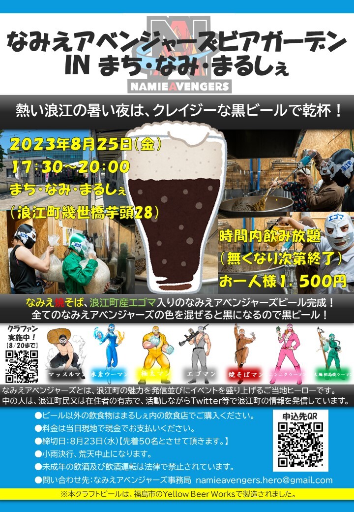 なみえ焼そばと浪江町産エゴマをぶち込んで作ったクレイジーなビールでビアガーデンを開催します。