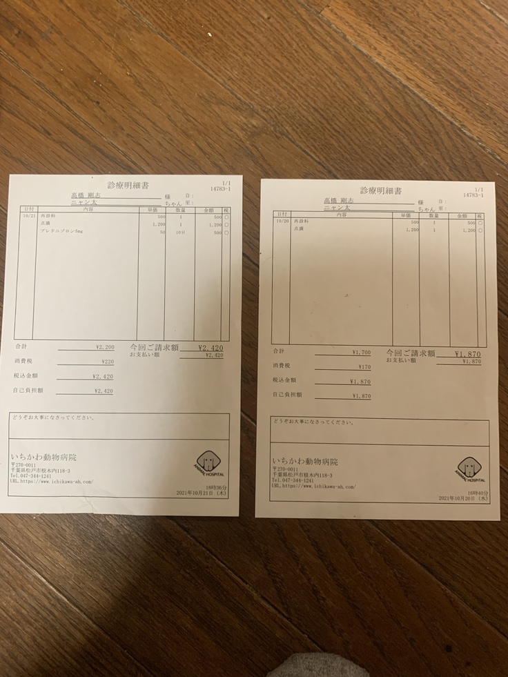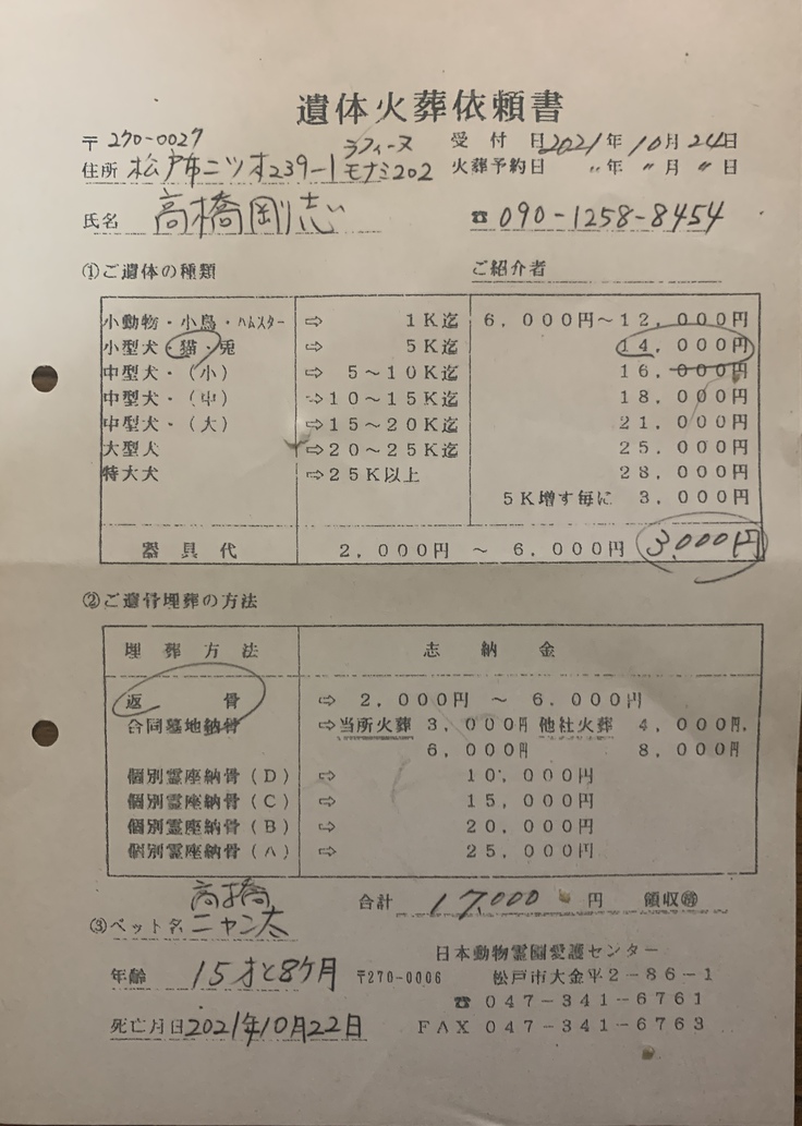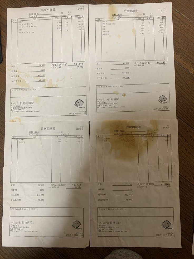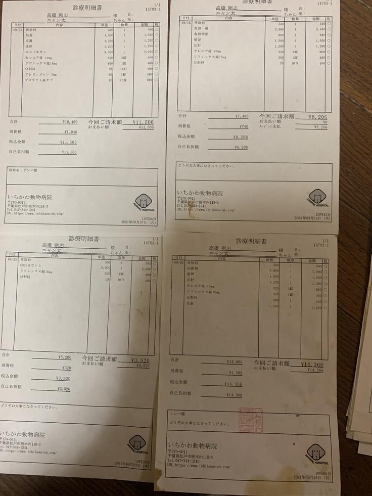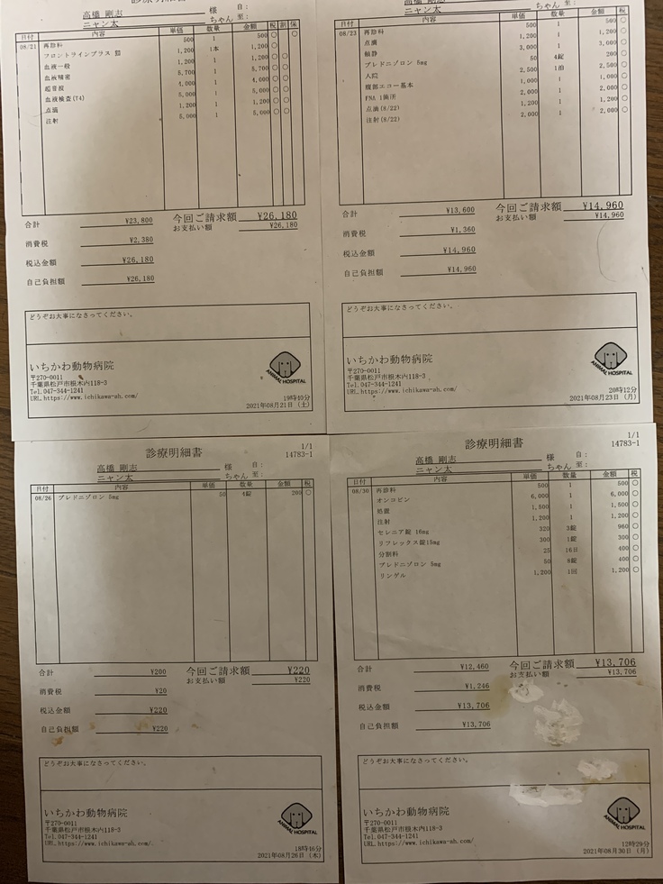 ニャン太の治療費、葬儀費は計160819円(クレジットカード払いですので金利、手数料を含みます)、リターンのための写真現像、郵送費は5340円。