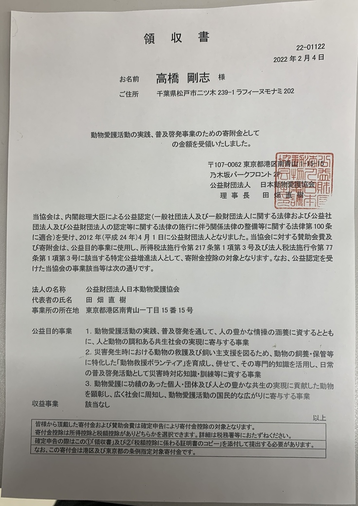 いただいた支援金はニャン太の治療費、葬儀費、仏具費に充当させていただき、残金は日本動物愛護協会へ寄付しました。