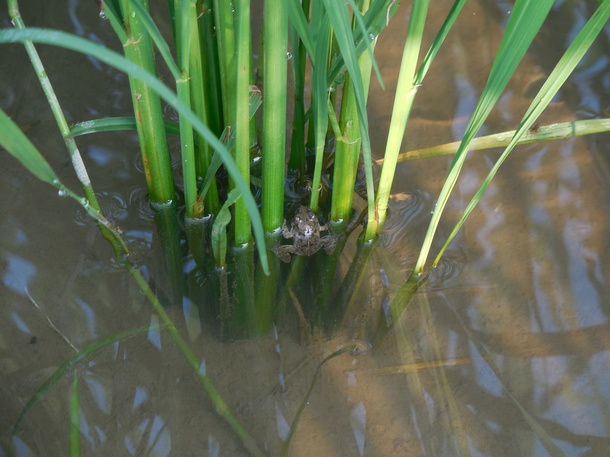 小さなカエルが稲の根っこの方にへばりついているのが可愛いですね。